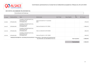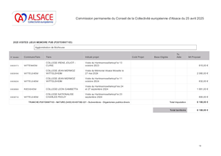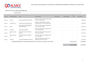 La Collectivité européenne d’Alsace, dans le cadre de sa politique éducative attribue des subventions pour les voyages et sorties scolaires organisés par les collèges et écoles publics et privés du Bas-Rhin et du Haut-Rhin. Le présent rapport a pour objet de proposer à la Commission permanente d’attribuer des subventions de fonctionnement pour un montant total de 244 736 € pour les voyages scolaires des collèges publics et privés du Bas-Rhin (1 668 élèves – 27 voyages), les sorties scolaires avec nuitées pour les collèges et écoles publics et privés du Haut-Rhin (2 291 élèves – 59 sorties scolaires avec nuitées), et les sorties vers les lieux de mémoire des collèges publics et privés (7938 élèves - 92 visites).