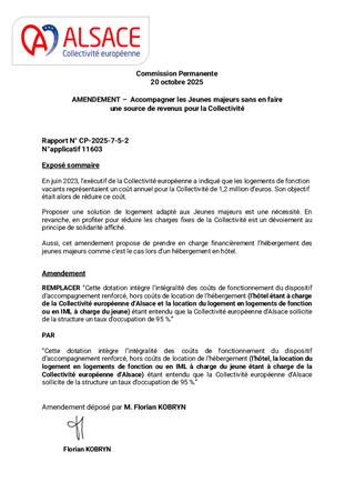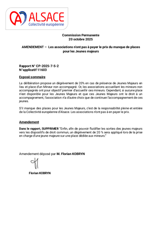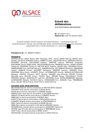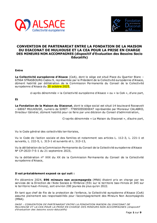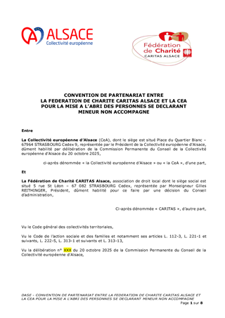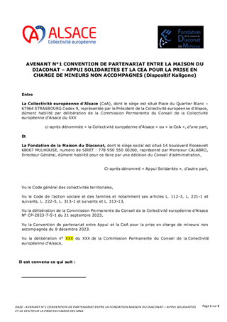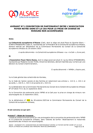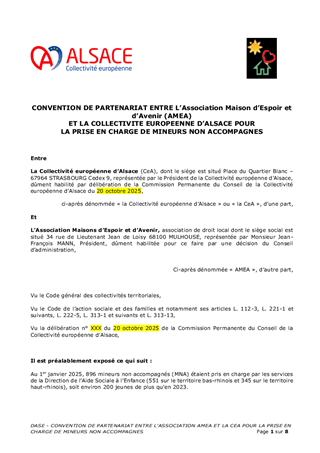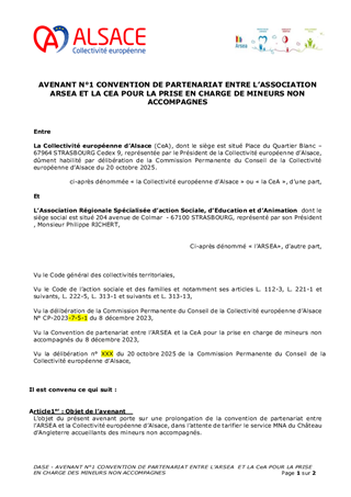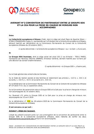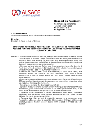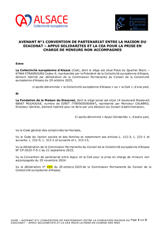 La Collectivité européenne d’Alsace, chargée de la Protection de l’Enfance, assure l’évaluation et la prise en charge des Mineurs Non Accompagnés (MNA) sur le territoire. Dans une volonté de structurer leur accompagnement selon une logique de parcours, tout en fluidifiant le dispositif et en améliorant les conditions d’accueil, plusieurs mesures sont proposées: • Nouveau partenariat avec Caritas pour la construction d’une offre de mise à l’abri: convention à compter du 1er novembre 2025, à tacite reconduction, pour un coût annuel de 1 361 345 €, financé via dotation. • Transfert de l’activité SAMI (suite à la cessation par Foyer Notre Dame) à la Fondation Maison du Diaconat, via une convention pour 2025 à tacite reconduction et pour un budget annuel de 1 952 750 €, financé dans le cadre d’une dotation. • Prolongation des activités des associations Foyer Notre Dame, ARSEA et Groupe SOS, partenaires historiques, via des avenants aux conventions existantes, selon les modalités définies précédemment. • Convergence tarifaire des divers opérateurs MNA: - signature de deux avenants aux conventions historiques de la Fondation Maison du Diaconat, pour un montant annuel de 5 385 028 € pour l'année 2025, et de 5 445 800 € à compter du 1er janvier 2026, à tacite reconduction. - signature d’une convention à tacite reconduction avec AMEA, opérateur historique, avec versement d’une dotation annuelle de 602 250 € pour 2025 et 657 000 € à partir du 1er janvier 2026. • Parcours des MNA arrivant à majorité: avenant à la convention avec l’association L’Étage, portant la capacité à 80 mesures en 2025 puis 100 mesures en 2026, avec une dotation annuelle de 371 500 € en 2025 et 474 000 € à partir de 2026 .