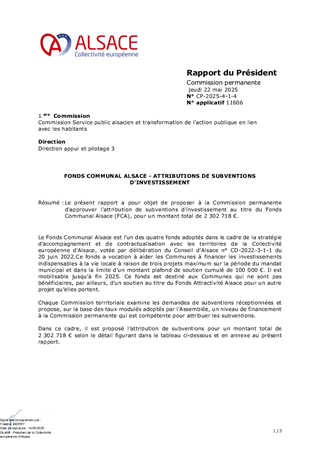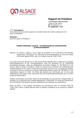 Le présent rapport a pour objet de proposer à la Commission permanente d'approuver l'attribution de subventions d'investissement au titre du Fonds Communal Alsace (FCA), pour un montant total de 2 302 718 €.