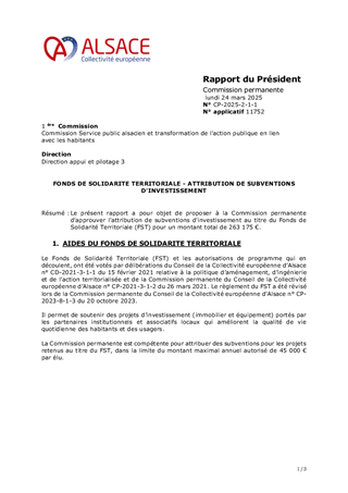 Le présent rapport a pour objet de proposer à la Commission permanente d'approuver l'attribution de subventions d'investissement au titre du Fonds de Solidarité Territoriale (FST) pour un montant total de 263 175 €.