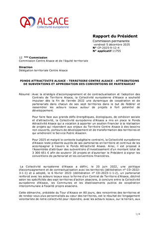 Avec la stratégie d’accompagnement et de contractualisation et l’adoption des Contrats de Territoire Alsace, la Collectivité européenne d’Alsace a souhaité impulser dès la fin de l’année 2022 une dynamique de coopération et de partenariats dans chacun de ses sept territoires dans le but de fédérer et rassembler les acteurs locaux autour de projets à fort potentiel de développement. Pour faire face aux grands défis énergétiques, écologiques, de cohésion sociale et d’attractivité, la Collectivité européenne d’Alsace a mis en place le Fonds Attractivité Alsace qui a vocation à apporter un soutien financier à la réalisation de projets qui répondent aux enjeux du Territoire Centre Alsace à des besoins non couverts, porteurs de développement et de transformation des territoires et qui améliorent le Service Public Alsacien. Pour 2025 et malgré le contexte budgétaire contraint, la Collectivité européenne d’Alsace reste présente auprès de ses partenaires en territoire et continue de les accompagner à travers le Fonds Attractivité Alsace. Ainsi, il est proposé à l’Assemblée d’attribuer des subventions d'investissement d'un montant total de 3 300 651 € afin de soutenir 20 projets et d'autoriser le Président à signer les conventions de partenariat et les conventions financières.