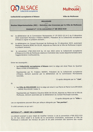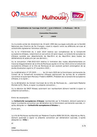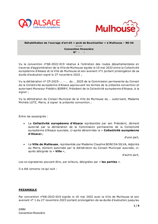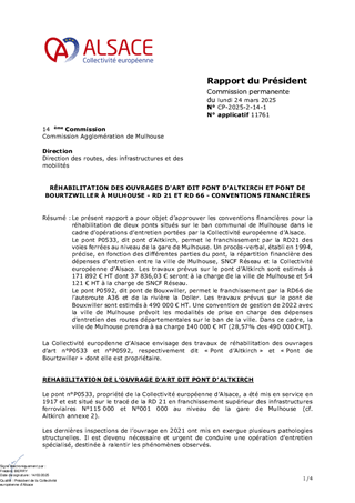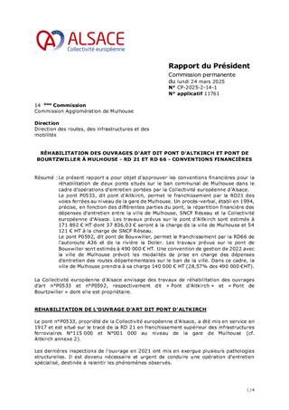 Le présent rapport a pour objet d’approuver les conventions financières pour la réhabilitation de deux ponts situés sur le ban communal de Mulhouse dans le cadre d’opérations d’entretien portées par la Collectivité européenne d’Alsace. Le pont P0533, dit pont d’Altkirch, permet le franchissement par la RD21 des voies ferrées au niveau de la gare de Mulhouse. Un procès-verbal, établi en 1994, précise, en fonction des différentes parties du pont, la répartition financière des dépenses d’entretien entre la ville de Mulhouse, SNCF Réseau et la Collectivité européenne d’Alsace. Les travaux prévus sur le pont d’Altkirch sont estimés à 171 892 € HT dont 37 836,03 € seront à la charge de la ville de Mulhouse et 54 121 € HT à la charge de SNCF Réseau. Le pont P0592, dit pont de Bouxwiller, permet le franchissement par la RD66 de l’autoroute A36 et de la rivière la Doller. Les travaux prévus sur le pont de Bouxwiller sont estimés à 490 000 € HT. Une convention de gestion de 2022 avec la ville de Mulhouse prévoit les modalités de prise en charge des dépenses d’entretien des routes départementales sur le ban de la ville. Dans ce cadre, la ville de Mulhouse prendra à sa charge 140 000 € HT (28,57% des 490 000 €HT).
