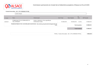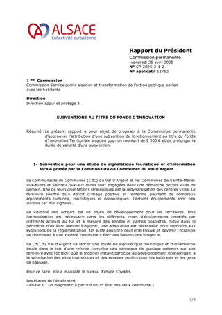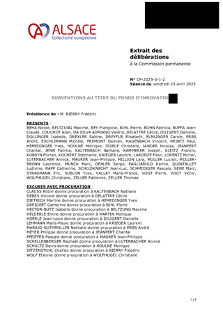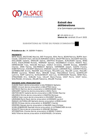 Le présent rapport a pour objet de proposer à la Commission permanente d’approuver l’attribution d’une subvention de fonctionnement au titre du Fonds d’Innovation Territoriale alsacien pour un montant de 9 500 € et de prolonger la durée de validité d’une subvention.