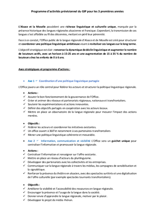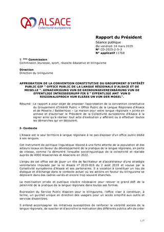 Le rapport a pour objet de proposer l’approbation de la convention constitutive du Groupement d’Intérêt Public « Office Public de la Langue Régionale d’Alsace et de Moselle / Babbelhüss – La maison pour votre langue régionale » jointe en annexe et d’autoriser le Président de la Collectivité européenne d'Alsace à la signer ainsi qu’à réaliser tout acte d’exécution y afférent ou à effectuer toutes les démarches qui en découlent.