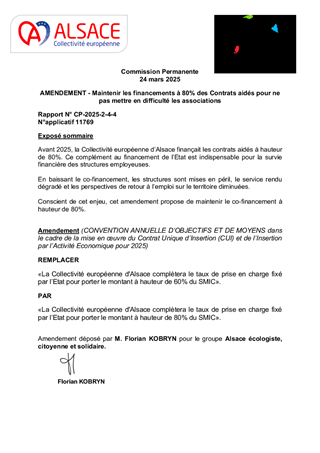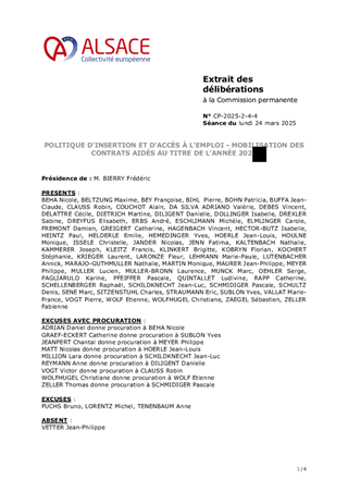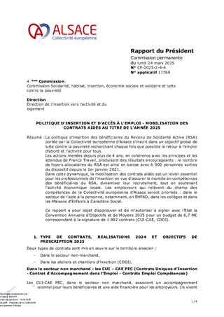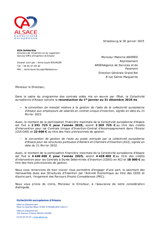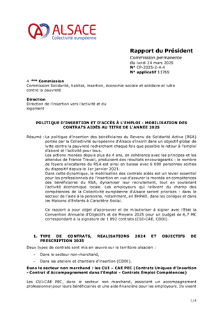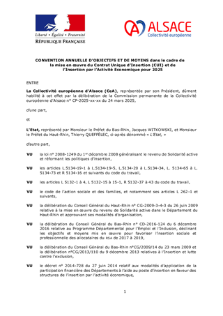 La politique d’insertion des bénéficiaires du Revenu de Solidarité Active (RSA) portée par la Collectivité européenne d’Alsace s’inscrit dans un objectif global de lutte contre la pauvreté recherchant chaque fois que possible le retour à l’emploi d’abord et l’activité pour tous. Les actions menées depuis plus de 4 ans, en cohérence avec les principes et les attendus de France Travail, produisent des résultats encourageants : le nombre de foyers allocataires du RSA est ainsi en baisse avec 6 000 personnes sorties du dispositif depuis le 1er janvier 2021. Dans cette dynamique, la mobilisation des contrats aidés est un levier essentiel pour les professionnels de l’insertion en vue d'assurer la montée en compétences des bénéficiaires du RSA, dynamiser leur recrutement, tout en soutenant l’activité économique locale. Les employeurs qui relèvent du champ des compétences de la Collectivité européenne d'Alsace seront priorisés : dans le secteur de l’aide à la personne, notamment, en EHPAD, dans les collèges et dans les Maisons d’Enfants à Caractère Social. Ce rapport a pour objet d’approuver et de m’autoriser à signer avec l’Etat la Convention Annuelle d’Objectifs et de Moyens 2025 pour un budget de 6,7 M€ correspondant à la signature de 1 892 contrats (CUI-CAE, CDDI).