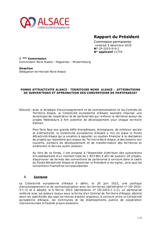 Avec la Stratégie d’accompagnement et de contractualisation et les Contrats de Territoire Alsace, la Collectivité européenne d'Alsace souhaite impulser une dynamique de coopération et de partenariats qui renforce la résilience autour de projets fédérateurs à fort potentiel de développement pour chaque territoire d’action. Pour faire face aux grands défis énergétiques, écologiques, de cohésion sociale et d’attractivité, la Collectivité européenne d'Alsace a mis en place le Fonds Attractivité Alsace qui a vocation à apporter un soutien financier à la réalisation de projets qui répondent aux enjeux du Territoire Nord Alsace, à des besoins non couverts, porteurs de développement et de transformation des territoires et améliorent le Service public alsacien. Au titre de ce fonds, il est proposé à l’Assemblée d’attribuer des subventions d’investissement d’un montant total de 1 823 801 € afin de soutenir 20 projets, d’approuver les termes des conventions de partenariat à conclure dans le cadre du Fonds Attractivité Alsace et d’autoriser le Président à les signer, ainsi que les conventions financières correspondantes