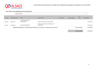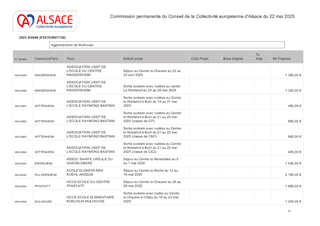 La Collectivité européenne d’Alsace, dans le cadre de sa politique éducative attribue des subventions pour les voyages et sorties scolaires organisés par les collèges et écoles publics et privés du Bas-Rhin et du Haut-Rhin. Le présent rapport a pour objet de proposer à la Commission permanente d’attribuer des subventions de fonctionnement pour un montant total de 58 367 €, pour les voyages scolaires des collèges publics et privés du Bas-Rhin (487 élèves – 9 voyages), les sorties scolaires avec nuitées pour les collèges et écoles publics et privés du Haut-Rhin (872 élèves – 22 sorties scolaires avec nuitées), et les sorties vers les lieux de mémoire des collèges publics et privés (1 313 élèves - 13 visites).