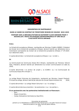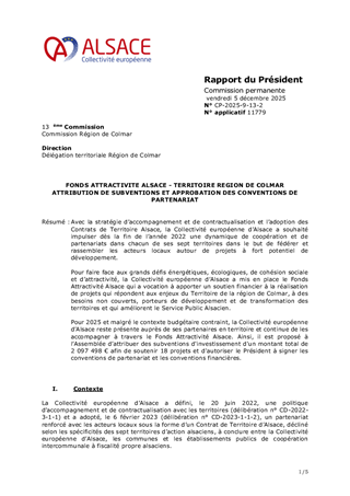 Avec la stratégie d’accompagnement et de contractualisation et l’adoption des Contrats de Territoire Alsace, la Collectivité européenne d’Alsace a souhaité impulser dès la fin de l’année 2022 une dynamique de coopération et de partenariats dans chacun de ses sept territoires dans le but de fédérer et rassembler les acteurs locaux autour de projets à fort potentiel de développement. Pour faire face aux grands défis énergétiques, écologiques, de cohésion sociale et d’attractivité, la Collectivité européenne d’Alsace a mis en place le Fonds Attractivité Alsace qui a vocation à apporter un soutien financier à la réalisation de projets qui répondent aux enjeux du Territoire de la région de Colmar, à des besoins non couverts, porteurs de développement et de transformation des territoires et qui améliorent le Service Public Alsacien. Pour 2025 et malgré le contexte budgétaire contraint, la Collectivité européenne d’Alsace reste présente auprès de ses partenaires en territoire et continue de les accompagner à travers le Fonds Attractivité Alsace. Ainsi, il est proposé à l’Assemblée d’attribuer des subventions d'investissement d'un montant total de 2 097 498 € afin de soutenir 18 projets et d'autoriser le Président à signer les conventions de partenariat et les conventions financières.