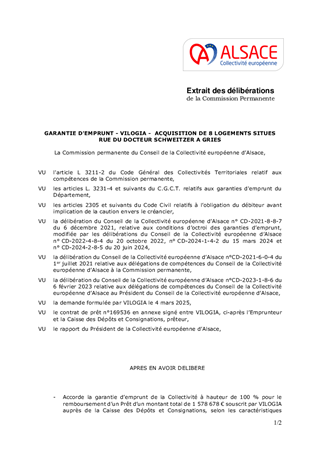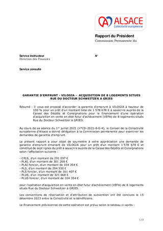 Il vous est proposé d’accorder la garantie d'emprunt à VILOGIA à hauteur de 100 % pour un prêt d’un montant total de 1 578 678 € à souscrire auprès de la Caisse des Dépôts et Consignations pour le financement d'une opération d’acquisition en vente en état futur d'achèvement (VEFA) de 8 logements situés Rue du Docteur Schweitzer à GRIES.
