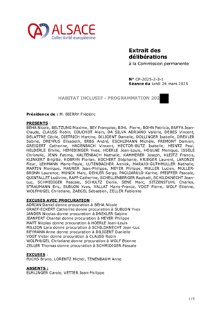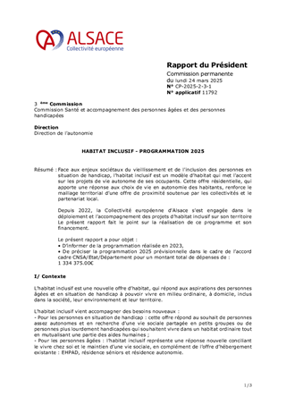 Face aux enjeux sociétaux du vieillissement et de l'inclusion des personnes en situation de handicap, l’habitat inclusif est un modèle d’habitat qui met l'accent sur les projets de vie autonome de ses occupants. Cette offre résidentielle, qui apporte une réponse aux choix de vie en autonomie des habitants, renforce le maillage territorial d’une offre de proximité soutenue par les collectivités et le partenariat local. Depuis 2022, la Collectivité européenne d'Alsace s'est engagée dans le déploiement et l'accompagnement des projets d’habitat inclusif sur son territoire Le présent rapport fait le point sur la réalisation de ce programme et son financement. Le présent rapport a pour objet : • D’informer de la programmation réalisée en 2023, • De préciser la programmation 2025 prévisionnelle dans le cadre de l’accord cadre CNSA/Etat/Département pour un montant total de dépenses de : 1 334 375.00€