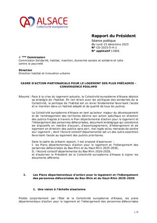 Face à la crise du logement actuelle, la Collectivité européenne d’Alsace déploie sa stratégie de l’habitat. En lien direct avec les politiques des solidarités de la Collectivité, la politique de l’habitat est un levier fondamental favorisant l’accès et le maintien dans un habitat adapté et de qualité de tous les publics. La Collectivité européenne d’Alsace en tant qu’acteur majeur du développement et de l’aménagement des territoires décline son action spécifique en direction des publics fragiles à travers le Plan départemental d’action pour le logement et l’hébergement des personnes défavorisées, document stratégique qui coordonne les dispositifs en matière d’accueil, d’accompagnement, d’hébergement et de logement en direction des publics sans abri, mal logés et/ou menacés de perdre leur logement ; dont l’Accord collectif départemental est un des outils essentiels favorisant l’accès au logement des publics prioritaires. Dans le cadre du présent rapport, il est proposé d’approuver : I. les Plans départementaux d’action pour le logement et l’hébergement des personnes défavorisées du Bas-Rhin et du Haut-Rhin 2025-2030, II. l’Accord collectif départemental du Bas-Rhin 2026-2028, et d’autoriser le Président de la Collectivité européenne d’Alsace à signer les documents afférents.