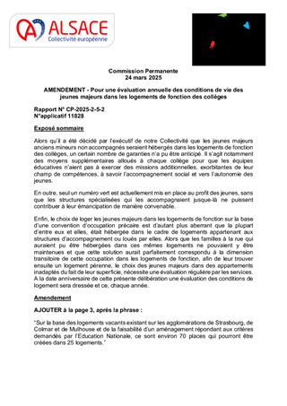 La Collectivité européenne d’Alsace, compétente en matière de protection de l’enfance, a approuvé les termes de sa nouvelle politique en faveur des jeunes majeurs, par délibération CD-2025-2-5-2 du 14 mars 2025. Confrontée à une dégradation significative du contexte social entrainant un engorgement sans précédent des dispositifs de protection et pour pallier à l’urgence de la situation, la Collectivité européenne d’Alsace et le Rectorat de l’Académie de Strasbourg s’accordent pour que des logements de fonction restés vacants au sein des collèges, puissent être affectés à des majeurs âgés de dix-huit à vingt et un ans, en situation d’emploi, d’apprentissage ou d’études supérieures, accompagnés par l’Aide sociale à l’enfance.