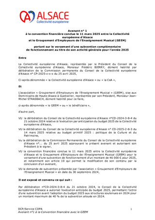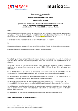 Le présent rapport a pour objet de proposer à la Commission permanente d’approuver l’attribution de subventions pour le soutien aux opérateurs culturels d'échelle alsacienne pour un montant total de 3 614 638 € en fonctionnement et d'autoriser le Président à signer les conventions financières à intervenir avec les structures concernées pour leurs activités en 2025.
