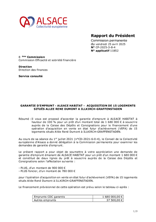 Il vous est proposé d’accorder la garantie d'emprunt à ALSACE HABITAT à hauteur de 100 % pour un prêt d’un montant total de 1 680 000 € à souscrire auprès de la Caisse des Dépôts et Consignations pour le financement d'une opération d’acquisition en vente en état futur d'achèvement (VEFA) de 15 logements situés Allée René Dumont à ILLKIRCH-GRAFFENSTADEN.