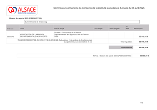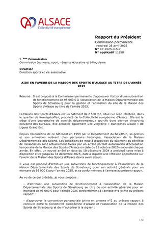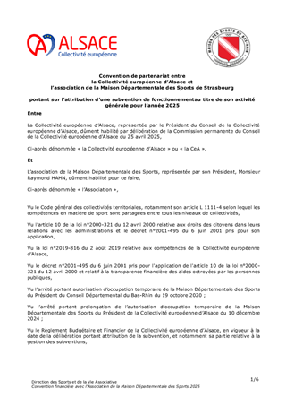 Il est proposé à la Commission permanente d'approuver l'octroi d'une subvention de fonctionnement de 95 000 € à l'association de la Maison Départementale des Sports de Strasbourg pour la gestion et l'animation du site de la Maison des Sports d'Alsace au titre de l'année 2025.