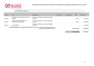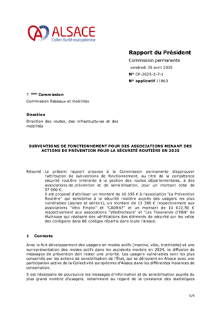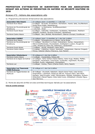 Le présent rapport propose à la Commission permanente d'approuver l'attribution de subventions de fonctionnement, au titre de la compétence sécurité routière inhérente à la gestion des routes départementales, à des associations de prévention et de sensibilisation, pour un montant total de 57 000 €. Il est proposé d'attribuer un montant de 10 355 € à l'association "La Prévention Routière" qui sensibilise à la sécurité routière auprès des usagers les plus vulnérables (jeunes et séniors), un montant de 13 300 € respectivement aux associations "Vélo Emploi" et "CADR67" et un montant de 10 022,50 € respectivement aux associations "VéloDocteurs" et "Les Tisserands d'EBN" de Mulhouse qui réalisent des vérifications des éléments de sécurité sur les vélos des collégiens dans 88 collèges répartis dans toute l'Alsace.