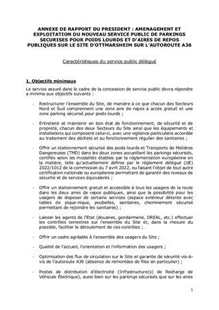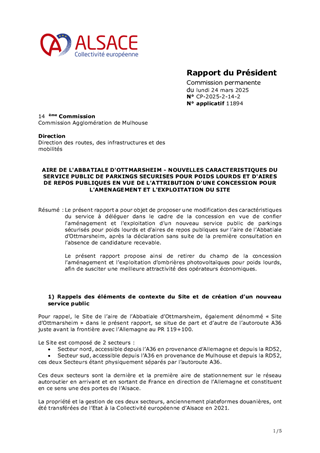 Le présent rapport a pour objet de proposer une modification des caractéristiques du service à déléguer dans le cadre de la concession en vue de confier l'aménagement et l'exploitation d'un nouveau service public de parkings sécurisés pour poids lourds et d'aires de repos publiques sur l’aire de l’Abbatiale d’Ottmarsheim, après la déclaration sans suite de la première consultation en l’absence de candidature recevable. Le présent rapport propose ainsi de retirer du champ de la concession l’aménagement et l’exploitation d’ombrières photovoltaïques pour poids lourds, afin de susciter une meilleure attractivité des opérateurs économiques.