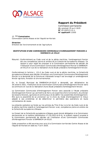 Conformément au Code rural et de la pêche maritime, l’aménagement foncier est une compétence pleine et entière de la Collectivité européenne d’Alsace. Ce rapport a pour objet de proposer à la Commission permanente de décider de l’institution d’une Commission Communale d’Aménagement Foncier à DAMBACH-LA-VILLE en vue de la réalisation d’une étude préalable d’aménagement foncier.