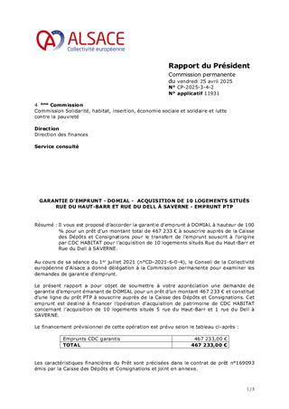 Il vous est proposé d’accorder la garantie d'emprunt à DOMIAL à hauteur de 100 % pour un prêt d’un montant total de 467 233 € à souscrire auprès de la Caisse des Dépôts et Consignations pour le transfert de l’emprunt souscrit à l’origine par CDC HABITAT pour l’acquisition de 10 logements situés Rue du Haut-Barr et Rue du Dell à SAVERNE.