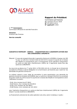 Il vous est proposé d’accorder la garantie d'emprunt à DOMIAL à hauteur de 100 % pour un prêt d’un montant total de 516 014 € à souscrire auprès de la Caisse des Dépôts et Consignations pour le financement d'une opération d’acquisition en vente en état futur d'achèvement (VEFA) de 4 logements situés Rue des Jardiniers à BRUMATH.