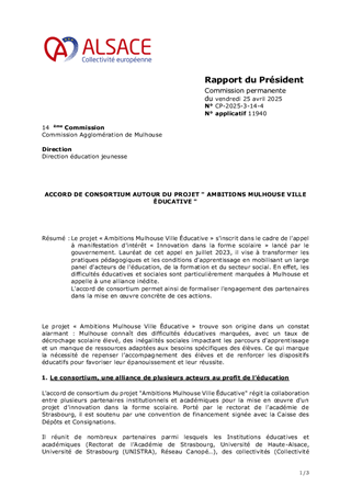 Le projet « Ambitions Mulhouse Ville Éducative » s'inscrit dans le cadre de l'appel à manifestation d'intérêt « Innovation dans la forme scolaire » lancé par le gouvernement. Lauréat de cet appel en juillet 2023, il vise à transformer les pratiques pédagogiques et les conditions d'apprentissage en mobilisant un large panel d'acteurs de l'éducation, de la formation et du secteur social. En effet, les difficultés éducatives et sociales sont particulièrement marquées à Mulhouse et appelle à une alliance inédite. L'accord de consortium permet ainsi de formaliser l'engagement des partenaires dans la mise en œuvre concrète de ces actions.