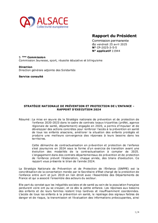 La mise en œuvre de la Stratégie nationale de prévention et de protection de l’enfance 2020-2023 dans le cadre de contrats locaux tripartites (préfet, agence régionale de santé, département) engagée en 2020, a permis d’impulser et de développer des actions concrètes pour renforcer l’accès à la prévention en santé de tous les enfants alsaciens, améliorer la situation des enfants protégés et produire une meilleure convergence des réponses à leurs besoins dans les territoires. Cette démarche de contractualisation en prévention et protection de l’enfance s’est poursuivie en 2024 sous la forme d’un exercice de transition avant une évolution des modalités de la contractualisation à compter de 2025. L’engagement dans des contrats départementaux de prévention et de protection de l’enfance prévoit l'élaboration, chaque année, des bilans d’exécution. Ce rapport vous présente le bilan de l’année 2024.