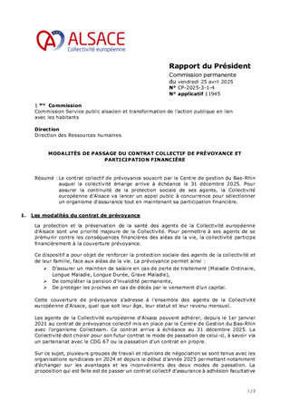 Le contrat collectif de prévoyance souscrit par le Centre de gestion du Bas-Rhin auquel la collectivité émarge arrive à échéance le 31 décembre 2025. Pour assurer la continuité de la protection sociale de ses agents, la Collectivité européenne d'Alsace va lancer un appel public à concurrence pour sélectionner un organisme d’assurance tout en maintenant sa participation financière.
