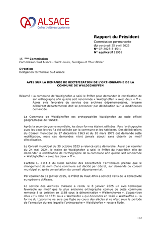 AVIS SUR LA DEMANDE DE RECTIFICATION DE L'ORTHOGRAPHE DE LA COMMUNE DE WALDIGHOFFEN