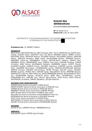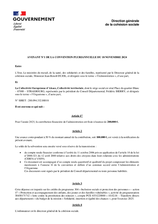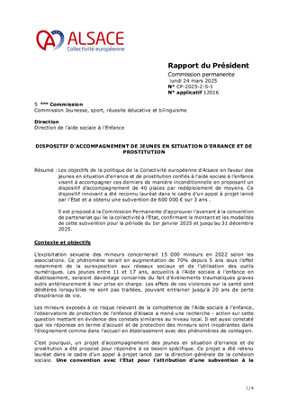 Les objectifs de la politique de la Collectivité européenne d'Alsace en faveur des jeunes en situation d’errance et de prostitution confiés à l’aide sociale à l’enfance visent à accompagner ces derniers de manière inconditionnelle en proposant un dispositif d’accompagnement de 40 places par redéploiement de moyens. Ce dispositif innovant a été reconnu lauréat dans le cadre d’un appel à projet lancé par l’Etat et a obtenu une subvention de 600 000 € sur 3 ans . Il est proposé à la Commission Permanente d’approuver l'avenant à la convention de partenariat qui lie la collectivité à l’Etat, confirmant le montant et les modalités de cette subvention pour la période du 1er janvier 2025 et jusqu’au 31 décembre 2025.