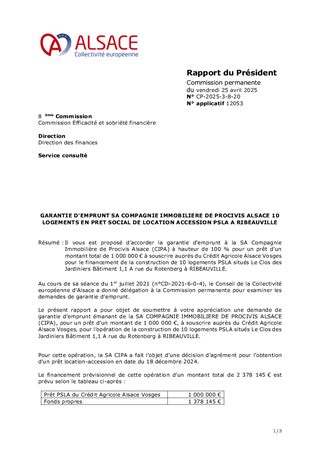 Il vous est proposé d’accorder la garantie d'emprunt à la SA Compagnie Immobilière de Procivis Alsace (CIPA) à hauteur de 100 % pour un prêt d’un montant total de 1 000 000 € à souscrire auprès du Crédit Agricole Alsace Vosges pour le financement de la construction de 10 logements PSLA situés Le Clos des Jardiniers Bâtiment 1,1 A rue du Rotenberg à RIBEAUVILLE.
