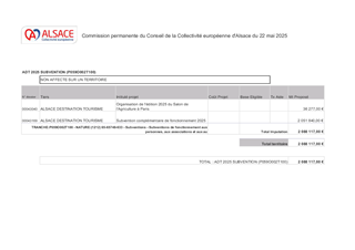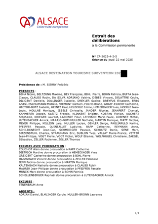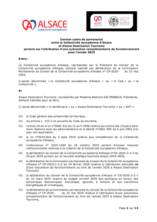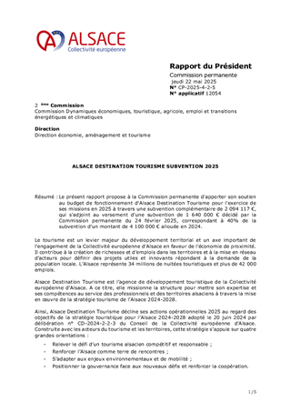 Le présent rapport propose à la Commission permanente d'apporter son soutien au budget de fonctionnement d'Alsace Destination Tourisme pour l'exercice de ses missions en 2025 à travers une subvention complémentaire de 2 094 117 €, qui s'adjoint au versement d'une subvention de 1 640 000 € décidé par la Commission permanente du 24 février 2025, correspondant à 40% de la subvention d’un montant de 4 100 000 € allouée en 2024.