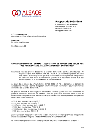 Il vous est proposé d’accorder la garantie d'emprunt à DOMIAL à hauteur de 100 % pour un prêt d’un montant total de 2 005 620 € à souscrire auprès de la Caisse des Dépôts et Consignations pour le financement d'une opération d’acquisition en vente en état futur d'achèvement (VEFA) de 8 logements situés Rue des Mérovingiens à KLEINFRANKENHEIM-SCHNERSHEIM.