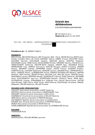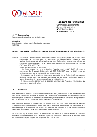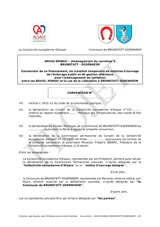 Le présent rapport a pour objet d’approuver le programme et les termes d’une convention à conclure avec la commune de BRUNSTATT-DIDENHEIM pour réaliser les travaux de sécurisation par la création d’un giratoire au niveau du carrefour entre les RD 433 et RD 8bisI pour un montant prévisionnel de 750 000 € HT soit 900 000€ TTC. Cette convention porte donc sur : - le financement de cette opération (prévisionnel à 487 500€ HT pour la commune de Brunstatt-Didenheim et 262 500€ HT pour la CeA) avec un préfinancement porté en totalité par la commune ; - le transfert de la maîtrise d’ouvrage au profit de la Collectivité européenne d’Alsace concernant les travaux connexes au carrefour (éclairage public et raccordement de la rue communale de la Libération) ; - la responsabilité concernant la gestion ultérieure de l’ouvrage réaménagé qui passera en agglomération.