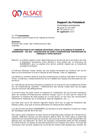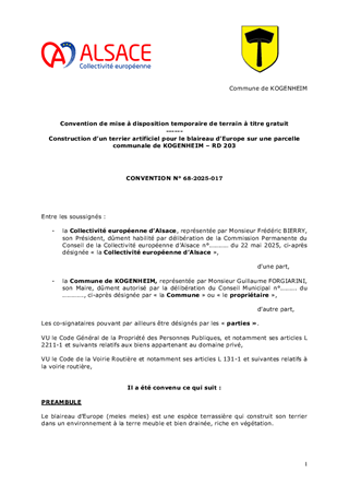 Le présent rapport a pour objet d’approuver les termes de la convention de mise à disposition temporaire d'une parcelle à titre gratuit par la Commune de KOGENHEIM, pour la création d'un terrier artificiel installé par la Collectivité européenne d’Alsace.