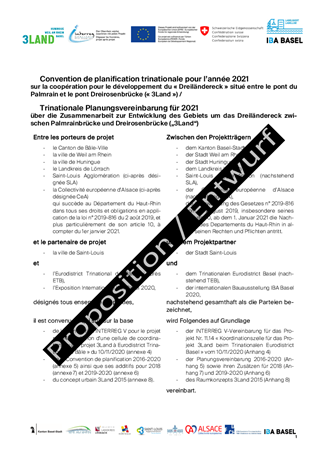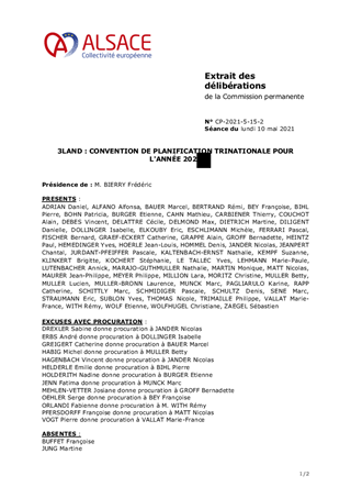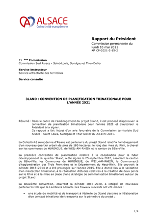 Dans le cadre de l'aménagement du projet 3Land, il est proposé d’approuver la convention de planification trinationale pour l’année 2021 et d'autoriser le Président à la signer. Ce rapport a fait l'objet d'un avis favorable de la Commission territoriale Sud Alsace - Saint-Louis, Sundgau et Thur-Doller du 23 avril 2021.