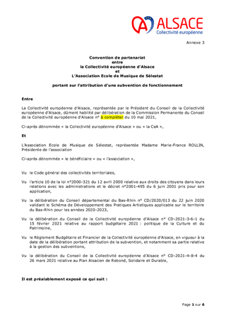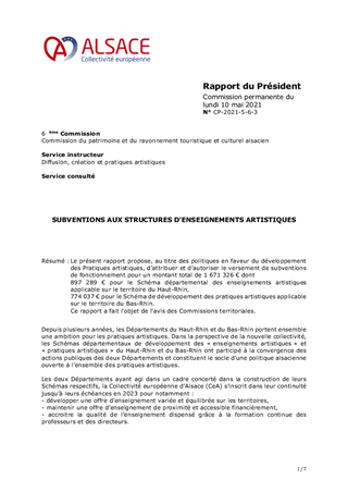 Le présent rapport propose, au titre des politiques en faveur du développement des Pratiques artistiques, d’attribuer et d’autoriser le versement de subventions de fonctionnement pour un montant total de 1 671 326 € dont 897 289 € pour le Schéma départemental des enseignements artistiques applicable sur le territoire du Haut-Rhin, 774 037 € pour le Schéma de développement des pratiques artistiques applicable sur le territoire du Bas-Rhin. Ce rapport a fait l'objet de l'avis des Commissions territoriales.