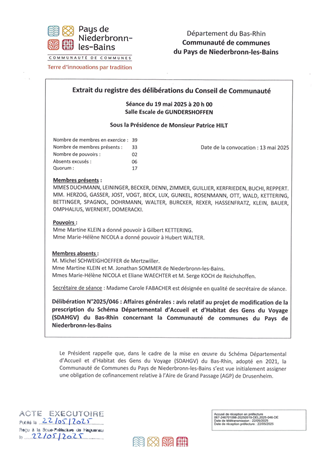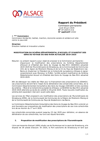 Le présent rapport a pour objet de proposer à la Commission permanente : d'approuver la modification des prescriptions du Schéma Départemental d’Accueil et d’Habitat des Gens du Voyage du Bas-Rhin (SDAHGV) actualisé 2019-2025 de l'Eurométropole de Strasbourg, de la Communauté de Communes (CC) de la région de Molsheim-Mutzig et de la CC du Pays de Niederbronn-les-Bains et d'autoriser le Président de la Collectivité européenne d'Alsace à signer conjointement avec Monsieur le Préfet, l'arrêté portant modification du Schéma Départemental Accueil et d'Habitat des Gens du Voyage du Bas-Rhin actualisé 2019-2025.