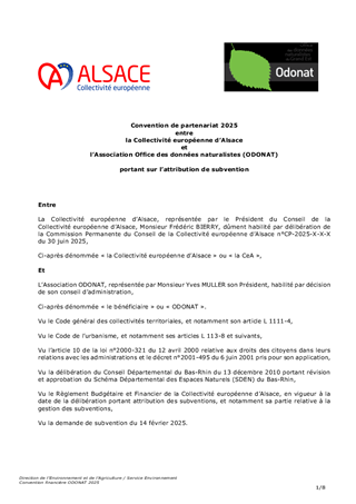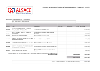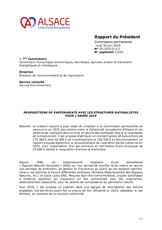 Le présent rapport a pour objet de proposer à la Commission permanente de poursuivre en 2025 des actions entre la Collectivité européenne d’Alsace et les partenaires impliqués dans la mise en œuvre des politiques liées à la reconquête de la biodiversité. Il est proposé d’attribuer un montant global de subventions de 175 380 € dont 18 850 € en investissement et 156 530 € en fonctionnement. Le rapport propose également le renouvellement de l'opération Sainte Catherine en 2025, avec l'organisation d'un jeu-concours et l'attribution d'une enveloppe de 15 000 € dédiée à l'acquisition d'arbres et d'arbustes.