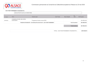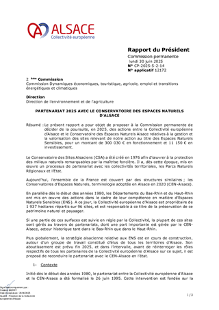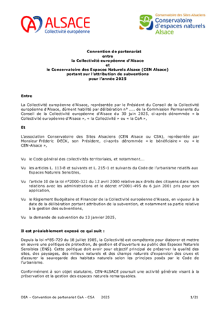 Le présent rapport a pour objet de proposer à la Commission permanente de décider de la poursuite, en 2025, des actions entre la Collectivité européenne d’Alsace et le Conservatoire des Espaces Naturels Alsace relatives à la gestion et la valorisation des sites relevant de notre action au titre des Espaces Naturels Sensibles, pour un montant de 300 030 € en fonctionnement et 11 150 € en investissement.