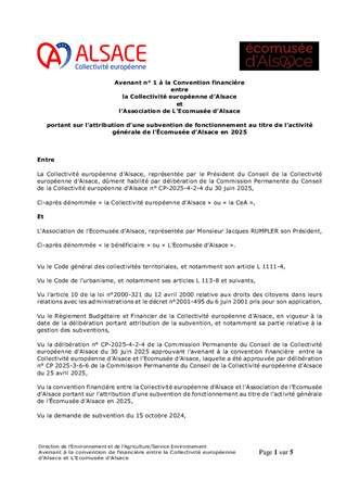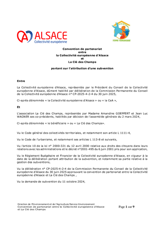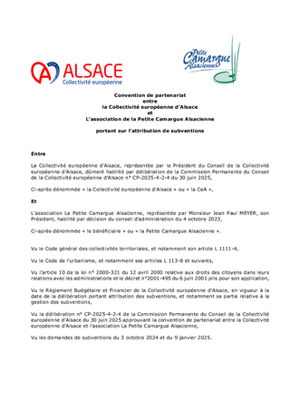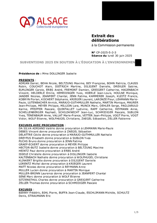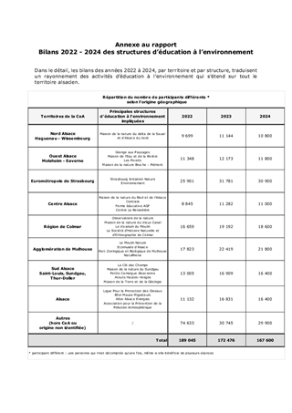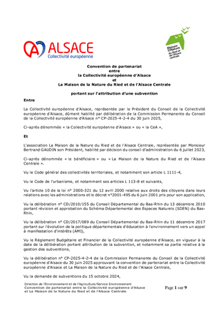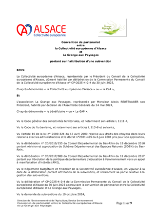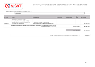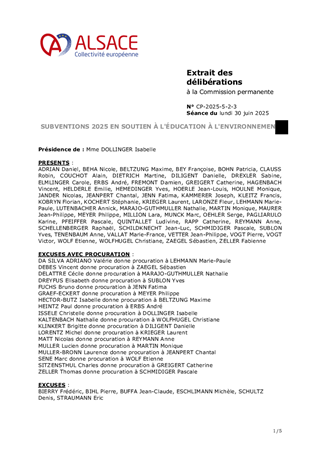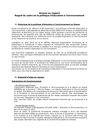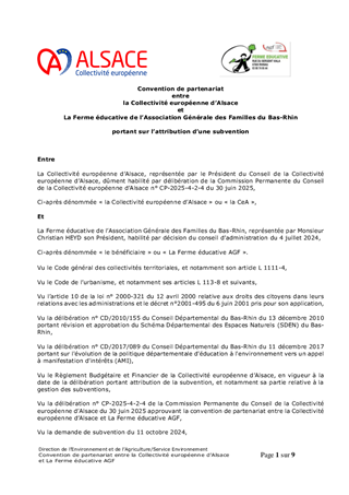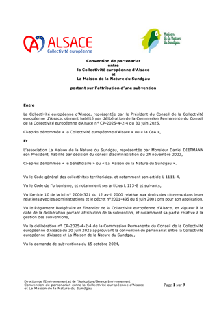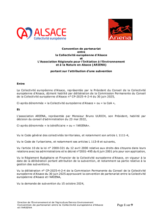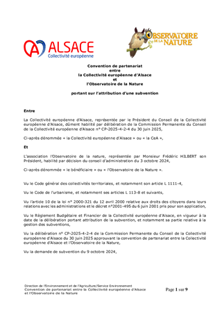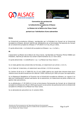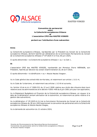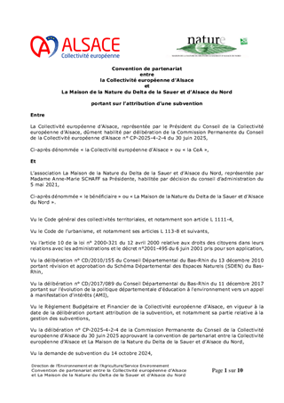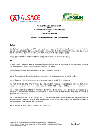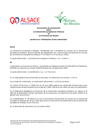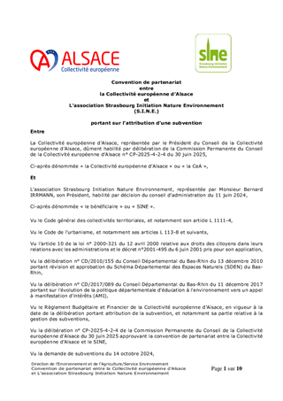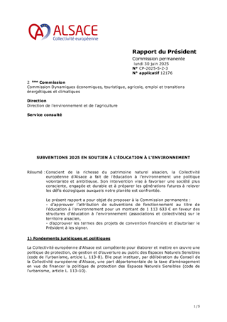 Conscient de la richesse du patrimoine naturel alsacien, la Collectivité européenne d’Alsace a fait de l’éducation à l’environnement une politique volontariste et ambitieuse. Son intervention vise à favoriser une société plus consciente, engagée et durable et à préparer les générations futures à relever les défis écologiques auxquels notre planète est confrontée. Le présent rapport a pour objet de proposer à la Commission permanente : - d'approuver l'attribution de subventions de fonctionnement au titre de l'éducation à l'environnement pour un montant de 1 113 633 € en faveur des structures d'éducation à l'environnement (associations et collectivités) sur le territoire alsacien, - d'approuver les termes des projets de convention financière et d'autoriser le Président à les signer.