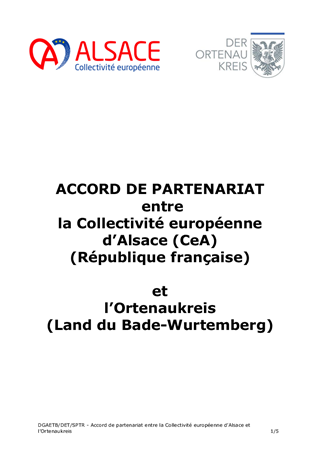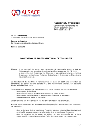 Il est proposé de signer une convention de partenariat entre la CeA et l’Ortenaukreis, sur le modèle de celle qui a été en vigueur de 2017 à 2020. La convention met l’accent sur les échanges et les projets communs en matière de santé, de protection de l’enfance, de tourisme et de transports. Elle est sans incidence financière.