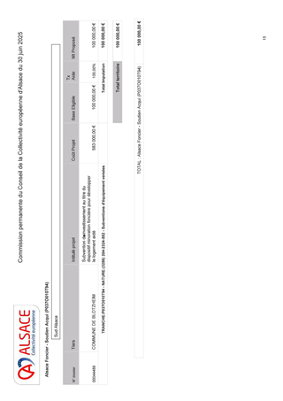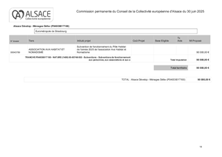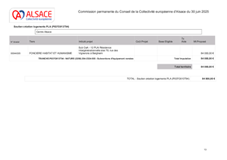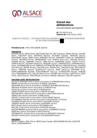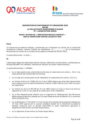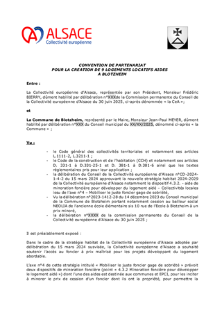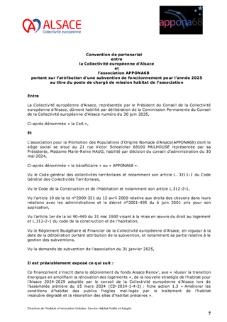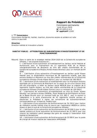 Dans le cadre de la stratégie habitat 2024-2029 de la Collectivité européenne d'Alsace, il est proposé d'approuver : I - L'attribution d’une subvention d'investissement au bailleur social Habitat et Humanisme pour le financement de 12 logements PLAI de la Maison intergénérationnelle de Bergheim au titre des crédits volontaristes de la Collectivité européenne d’Alsace (Fonds Alsace Develop’) pour un montant de 84 000€. II - L’attribution d’une subvention d’investissement au bailleur social Alsace Habitat pour la réhabilitation thermique de 58 logements locatifs, quai des anciens abattoirs à Molsheim au titre des crédits volontaristes de la Collectivité européenne d’Alsace (Fonds Alsace Rénov’) pour un montant de 108 000 €. III - L'attribution d’une subvention d'investissement pour la minoration foncière appliquée par la Commune de Blotzheim sur la valeur du prix d’un foncier dont elle est propriétaire, à céder au bailleur social NEOLIA pour la création de 9 logements locatifs sociaux, au titre des crédits volontaristes de la Collectivité européenne d'Alsace (Fonds Alsace Foncier) pour un montant de 100 000 €. IV - L'attribution de subventions d'investissement au titre du Fonds "Alsace Dévelop" aux bailleurs sociaux DOMIAL, Foyer Moderne de Schiltigheim et Foyer de la Basse Bruche pour un montant total de 113 385 € pour le soutien à l'adaptation à la perte d'autonomie de 42 logements locatifs sociaux et d’autoriser le Président à signer les conventions de subventionnement correspondantes sur la base du modèle type. V - L’attribution d'une subvention de fonctionnement de 76 230 € pour l’action de médiation sociale habitat mise en œuvre par l'association ARSEA en centre Alsace et dans le sud de la Collectivité européenne d'Alsace. VI – L’attribution d’une subvention de fonctionnement de 90 000 € pour le pôle habitat précaire et d’une subvention de fonctionnement de 15 200 € pour une mission de médiation grand passage des gens du voyage à l’association AVA Habitat et Nomadisme. VII - L’attribution d’une subvention de fonctionnement de 20 000 € pour le poste de chargé de mission habitat de l’association APPONA68.