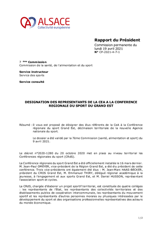 Il vous est proposé de désigner des élus référents de la CeA à la Conférence régionale du sport Grand Est, déclinaison territoriale de la nouvelle Agence nationale du sport. Le dossier a été validé par la 7ème Commission (santé, alimentation et sport) du 9 avril 2021.