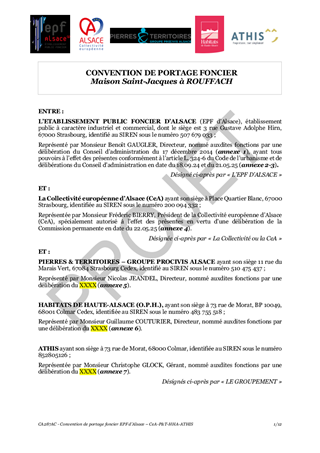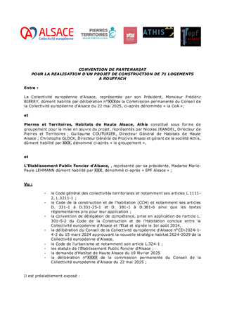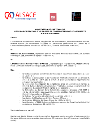 En tant que collectivité de rattachement de l’office public HLM, Habitats de Haute Alsace, il est proposé que la Collectivité européenne d’Alsace facilite l’accès au foncier pour deux projets : - Une opération sur le site de la Maison Saint-Jacques de Rouffach, comprenant 71 logements (accession et logements sociaux), située au 2 rue Maréchal Lefebvre / rue des Remparts, sur une surface de 58.50 ares, portée par le groupement constitué par Pierres et Territoires (PROCIVIS Alsace) – Habitats de Haute Alsace – Athis, - Une opération de 97 logements (accession et logements sociaux) située au 9 Grand’rue à Horbourg-Wihr, sur une surface de 104,72 ares, portée par Habitats de Haute Alsace. Pour ce faire, il vous est proposé que la Collectivité européenne d'Alsace mandate l’Etablissement Public Foncier d’Alsace afin que celui-ci puisse acquérir et porter le foncier.