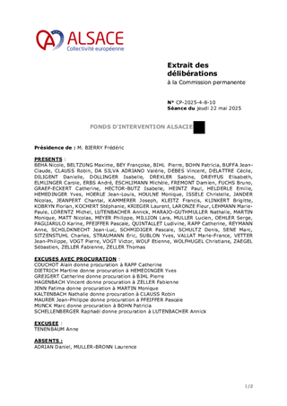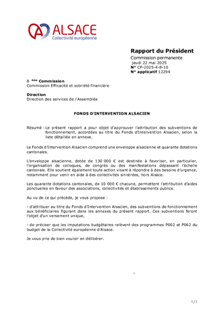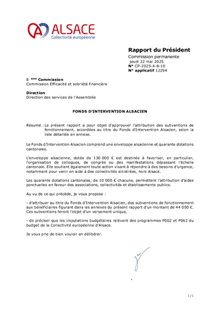 Le présent rapport a pour objet d'approuver l'attribution des subventions de fonctionnement, accordées au titre du Fonds d'Intervention Alsacien, selon la liste détaillée en annexe.