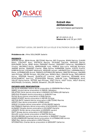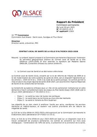 Le présent rapport propose à la Commission permanente d'approuver l'extension du périmètre géographique d'action du Contrat Local de Santé de la Ville d'Altkirch (2025-2028) et d'en autoriser la signature par Madame Sabine DREXLER, Conseillère d'Alsace du canton d'Altkirch.