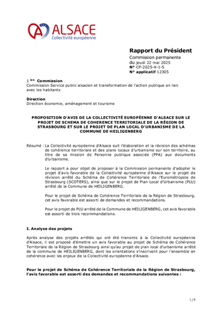PROPOSITION D'AVIS DE LA COLLECTIVITÉ EUROPÉENNE D'ALSACE SUR LE PROJET DE SCHEMA DE COHERENCE TERRITORIALE DE LA RÉGION DE STRASBOURG ET SUR LE PROJET DE PLAN LOCAL D'URBANISME DE LA COMMUNE DE HEILIGENBERG