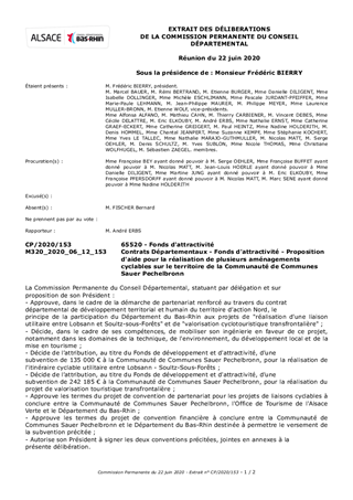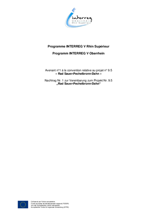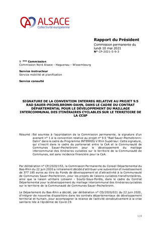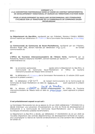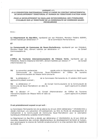 Est soumise à l'approbation de la Commission permanente, la signature d'un avenant n° 1 à la convention relative au projet n° 9.5 "Rad Sauer-Pechelbronn-Dahn" dans le cadre du Programme INTERREG V Rhin Supérieur. Cette signature, qui s’inscrit dans le cadre du partenariat entre la CeA et la Communauté de Communes Sauer-Pechelbronn pour le développement du maillage intercommunal des itinéraires cyclables sur le territoire de la Communauté de Communes, est sans incidence financière pour la CeA.