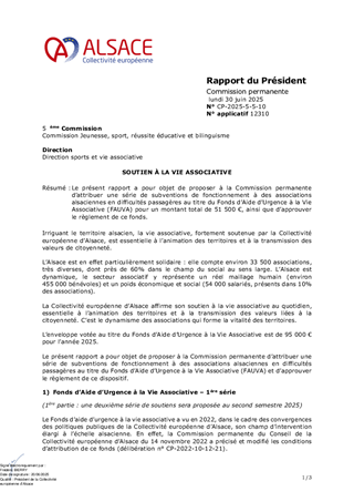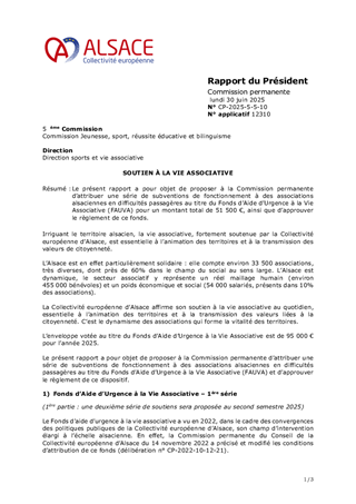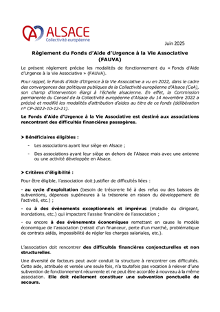 Le présent rapport a pour objet de proposer à la Commission permanente d’attribuer une série de subventions de fonctionnement à des associations alsaciennes en difficultés passagères au titre du Fonds d’Aide d’Urgence à la Vie Associative (FAUVA) pour un montant total de 51 500 €, ainsi que d’approuver le règlement de ce fonds.