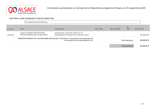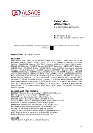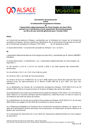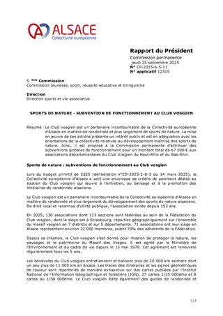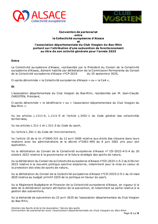 Le Club vosgien est un partenaire incontournable de la Collectivité européenne d'Alsace en matière de randonnée et plus largement de sports de nature. La mise en œuvre de ses actions présente un intérêt public et est en adéquation avec les orientations de la collectivité relatives au développement maîtrisé des sports de nature. Ainsi, il est proposé à la Commission permanente d'attribuer des subventions globales de fonctionnement pour un montant total de 67 000 € aux associations départementales du Club Vosgien du Haut-Rhin et du Bas-Rhin.